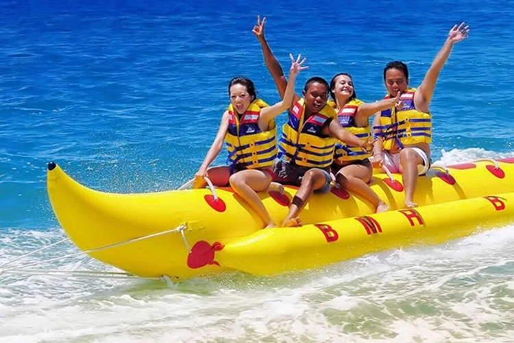 バナナのような形をしたゴムボートにまたがって、モーターボートにどんどん引っ張られます。仲間と一緒にスリルと興奮を味わえる大人気メニューです。 |
