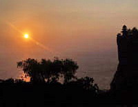 untuk mengisi liburan Anda di Bali.Tur menikmati sunset atau matahari terbenam di Bali, terdapat beberapa lokasi untuk menikmati sunset di Bali seperti Uluwatu, Pantai Kuta, Pura Tanah Lot. Menyajikan pemandangan yang indah dengan suasana lembayung senja menjelang matahari terbenam.Sunset di Pura Tanah Lot![]() ![]() ![]() Sampai saat ini Tanah Lot masih menjadi tempat yang paling indah untuk menikmati indahnya matahari terbenam, bahkan di dunia sekalipun. Tapi tidak setiap hari matahari terbenam bisa kita nikmati dengan bagus, sangat tergantung sekali dengan cuaca pada hari tersebut. Bila saat mendung dan berkabut jangankan kita bisa melihat sunset , matahari pun seakan enggan menampakkan sinarnya. jadi, sebelum anda memutuskan ke Tanah Lot ada baiknya bila kita melihat cuaca hari bersangkutan. Sekilas tentang Pura Tanah lot. Pura Tanah Lot ini terletak di Pantai Selatan Pulau Bali yaitu di wilayah kecamatan Kediri, Kabupaten Tabanan, yang pembangunannya erat kaitannya dengan perjalanan Danghyang Nirartha di Pulau Bali.Pada suatu waktu Danghyang Niratha datang kembali ke Pura Rambut Siwi di dalam perjalanan beliau kelilling pulau Bali, dimana dahulu tatkala beliau baru tiba di Bali dari Blambangan pada sekitar tahun icaka 1411 atau tahun 1489 M beliau pernah singgah di tempat ini. Setelah berada di Pura Rambut Siwi untuk beberapa lama, kemudian beliau melanjutkan perjalanannya menunju arah Timur . Perjalanan beliau ini menyusuri pantai Selatan pulau Bali Dalam perjalannya ini Danghyang Nirartha dapat menyaksikan bagaimana deburan ombak laut menerpa pantai menambah keindahan alam yang sangat mengasyikkan. Terbayang oleh beliau bagaimana kebesaran Sanghyang Widhi Wasa (Tuhan Yang Maha Esa ) yang telah menciptakan alam semesta dengan segala isinya yang dapat membrikan kehidupan bagi manusia. Karena asyik memperhatikan dan memandang keindahan alam dengan segala isinya, sampai ?sampai Dangyang Nirartha tidak merasakan kelelahan didalam perjalanannya. Sebagaimana biasanya di dalam perjalanan Danghyang Nirartha senantiasa membawa lontar dan pengrupak (pisau raut untuk menulis pada daun lontar ) sehingga apa-apa yang diangap penting baik yang dilihat maupun yang dirasakan kemudian disusun dalam bentuk kekawain atau gubahan lainnya. Demikian pula mengenai perjalanannya dari Pura Rambut Siwi ini, sehingga karena asyiknya beliau memperhatikan serta memandang dan memikirkan segala sesuatu yang dipandang penting dan akan digubah, tahu-tahu Danghyang Niratha sudah sampai pada suatu tempat di pantai Selatan dipantai Selatan pulau Bali. Di pantai ini terdapat sebuah pulau kecil yang terdiri dari tanah parangan (tanah keras) dan disinilah Danghyang Nirartha berhenti dan beristirahat. Tidak antara lama Dangyang Nirartha beristirahat disana, maka berdatangan kesana para nelayan untuk menghadap kepada Danghyang Nirartha sambil membawa berbagai persembahan untuk diaturkan kepada beliau. Kemudian setelah sore hari, para nelayan tersebut memohon kepada Danghyang Nirartha agar beliau berkenan bermalam dipondok mereka masing- masing, namun permohonannya ini semua ditolak oleh Danghyang Nirartha, karena beliau lebih senang bermalam di pulau kecil itu. Disamping hawanya segar, juga pemandangannya sangat indah dan dari sana belaiu dapat melepaskan pandangan secara bebas ke semua arah. Pada malam harinya sebelum Danghyang Nirartha beristirahat, beliau memberikan ajaran-ajaran seperti agama, susila dan ajaran kebajikan lainnya kepada orang-orang yang datang menghadap ke sana. Tatkala itu Danghyang Nirartha menasehatkan kepada orang-orang itu untuk membangun Pura disana karena menurut getaran batin beliau yang suci serta petunjuk gaib bahwa tempat itu baik untuk tempat memuja Sanghyang Widhi Wasa . Dari tempat ini kemudian rakyat dapat memuja kebesaran sanghyang Widhi Wasa untuk memohon wara nugrahaNya keselamatan dan kesejahteraan dunia. Demikian antara lain nasehat Danghyang Nirartha kepada orang-orang yang mengahadap pada malam hari itu, yang akhirnya sesudah Danghyang Nirartha meninggalkan tenpat itu, kemudian oleh orang-orang tersebut dibangunlah sebuah bangunan suci yang diberi nama Pura Pakendungan yang kini lebih dikenal dengan sebutan Pura Tanah Lot. Sunset di Pura Uluwatu![]() ![]() ![]() Tidak kalah indahnya dengan Pura Tanah lot, Pura Uluwatu juga merupakan tempat yang sangat sayang bila dilewatkan bila ingin menyaksikan terbenamnya matahari. Sambil menikmati sunset anda bisa juga menyaksikan tarian Kecak yang tiap hari dipentaskan di areal Pura Uluwatu. Pura Luhur Uluwatu merupakan tempat Pemujaan Dewa Rudra Pura ini berada di wilayah Desa Pecatu, Kecamatan Kuta, Badung -- dari Denpasar ke selatan sekitar 31 km. Pura Luhur Uluwatu merupakan salah satu dari enam buah pura yang berstatus Sad Kahyangan Jagat. Pura ini berdiri megah di ujung barat daya Pulau Bali di atas anjungan batu karang yang terjal dan tinggi serta menjorok ke laut. Pura Uluwatu terletak pada ketinggian 97 meter dari permukaan laut. Di depan pura terdapat hutan kecil yang disebut alas kekeran, berfungsi sebagai penyangga kesucian pura. Bagaimana sejarah berdirinya pura ini? Dalam beberapa sumber disebutkan, sekitar tahun 1489 Masehi datanglah ke Pulau Bali seorang purohita, sastrawan dan rohaniwan bernama Danghyang Dwijendra. Danghyang Dwijendra adalah seorang pendeta Hindu, kelahiran Kediri, Jawa Timur. Danghyang Dwijendra pada waktu walaka bernama Danghyang Nirartha. Beliau menikahi seorang putri di Daha, Jawa Timur. Di tempat itu pula beliau berguru dan di-diksa oleh mertuanya. Danghyang Nirartha dianugerahi bhiseka kawikon dengan nama Danghyang Dwijendra. Setelah di-diksa, Danghyang Dwijendra diberi tugas melaksanakan dharmayatra sebagai salah satu syarat kawikon. Dharmayatra ini harus dilaksanakan di Pulau Bali, dengan tambahan tugas yang sangat berat dari mertuanya yaitu menata kehidupan adat dan agama khususnya di Pulau Bali. Bila dianggap perlu dharmayatra itu dapat diteruskan ke Pulau Sasak dan Sumbawa. Danghyang Dwijendra data